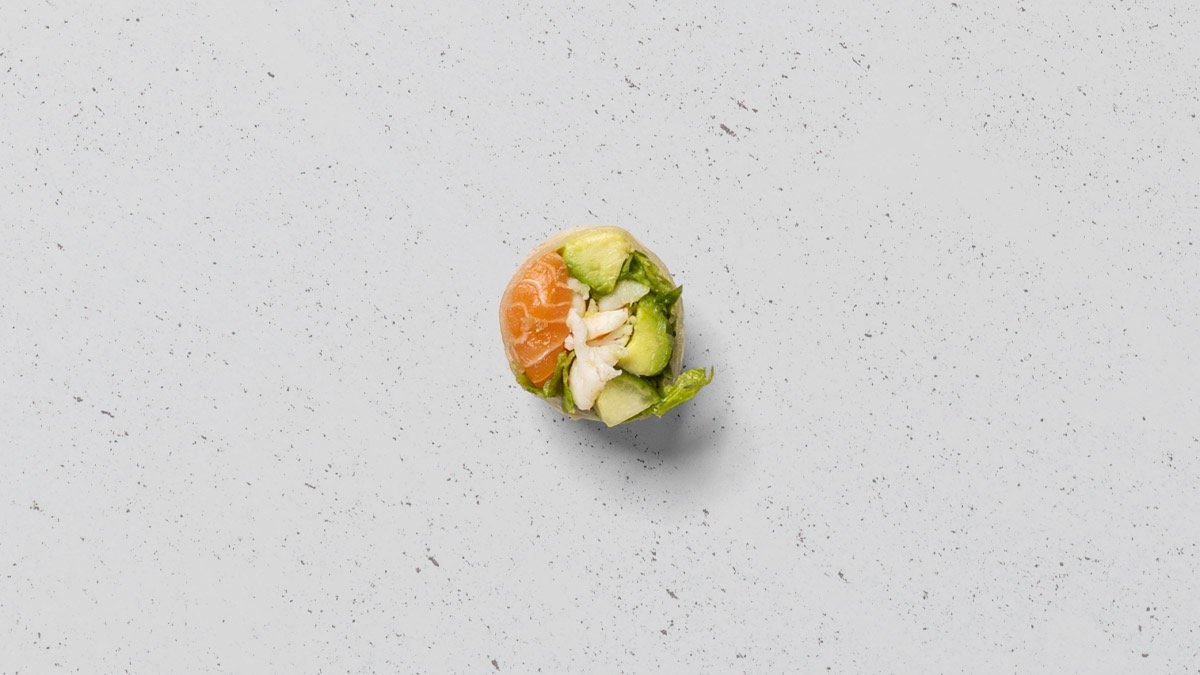 Sprødstegt laks, avocado, agurk, asparges og chilimayo, rullet i tang.