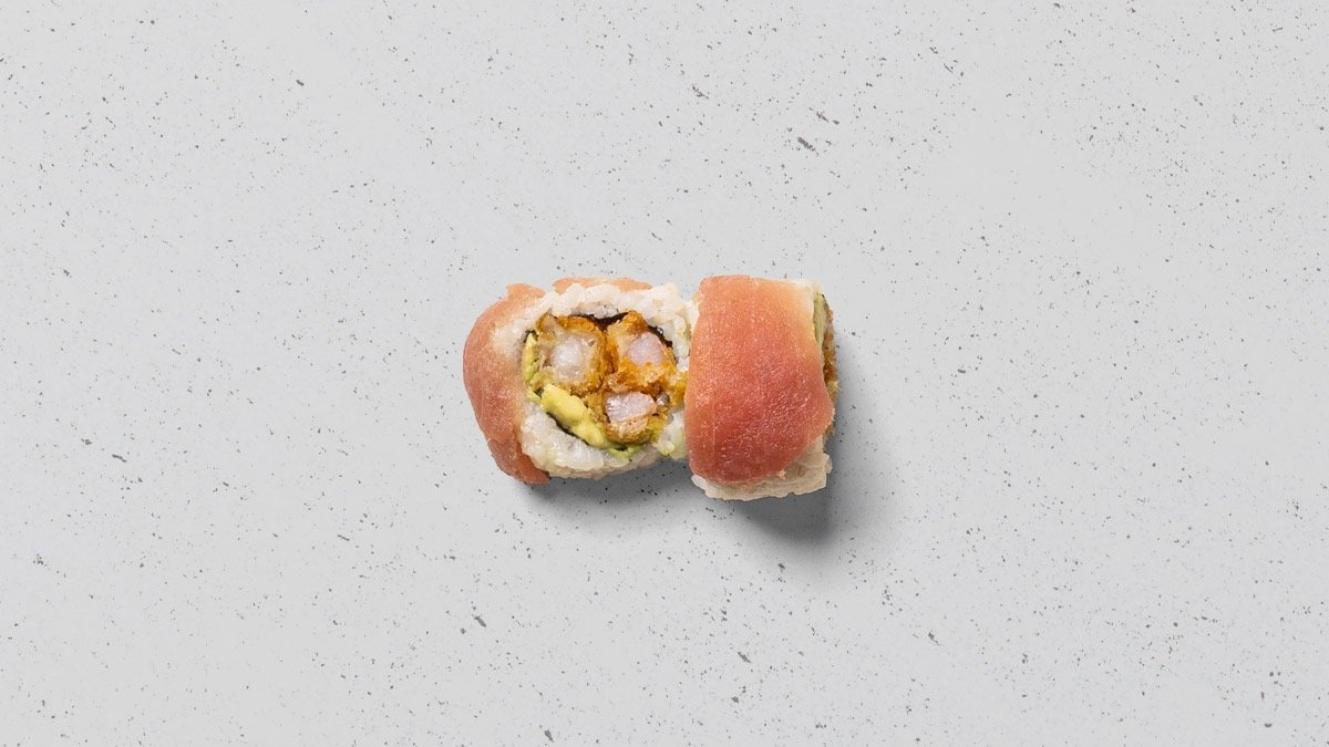 Stegt tun, avocado, agurk, mango, orange tobiko og chili mayo, rullet i tang.