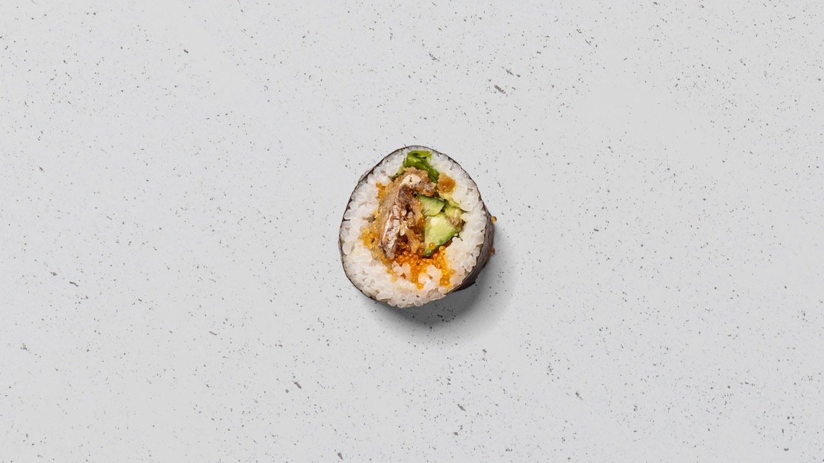 Softshell crab, avocado, agurk, orange tobikko og chili mayo, rullet i tang.
