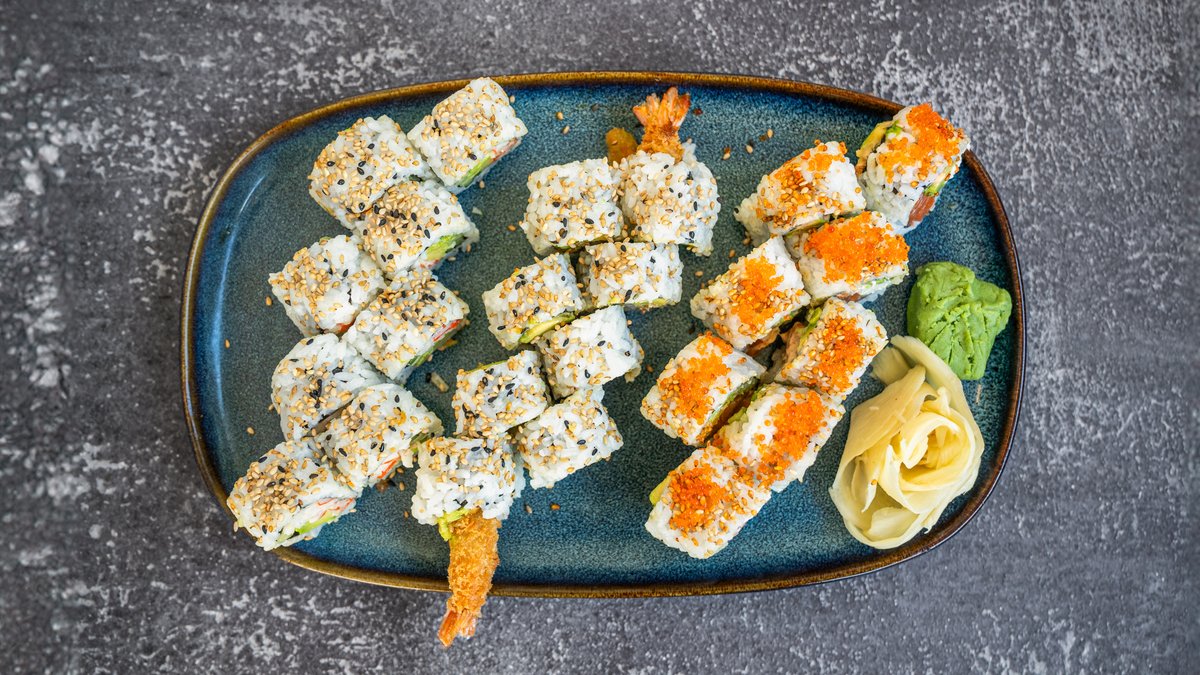 7 x Nigiri laks 7 x Nigiri tun 7 x Nigiri tun tataki 7 x Nigiri kingfish 7 x Nigiri grillet laks 8 x Rainbow California dragon roll 8 x Tun dragon roll 8 x Grillet laks dragon roll 6 x And rispapir 6 x Crispy kylling rispapir 8 x Spicy reje uramaki roll 6 x California Futomaki 6 x Crispy ebi futomaki