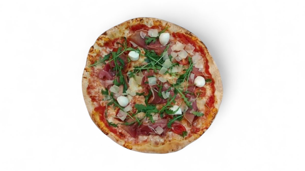 Parman kinkku, fior di mozzarella, kirsikkatomatti, buffalo mozzarella, hard Italian cheese, Parmesan cheese, olive oil, rucola
