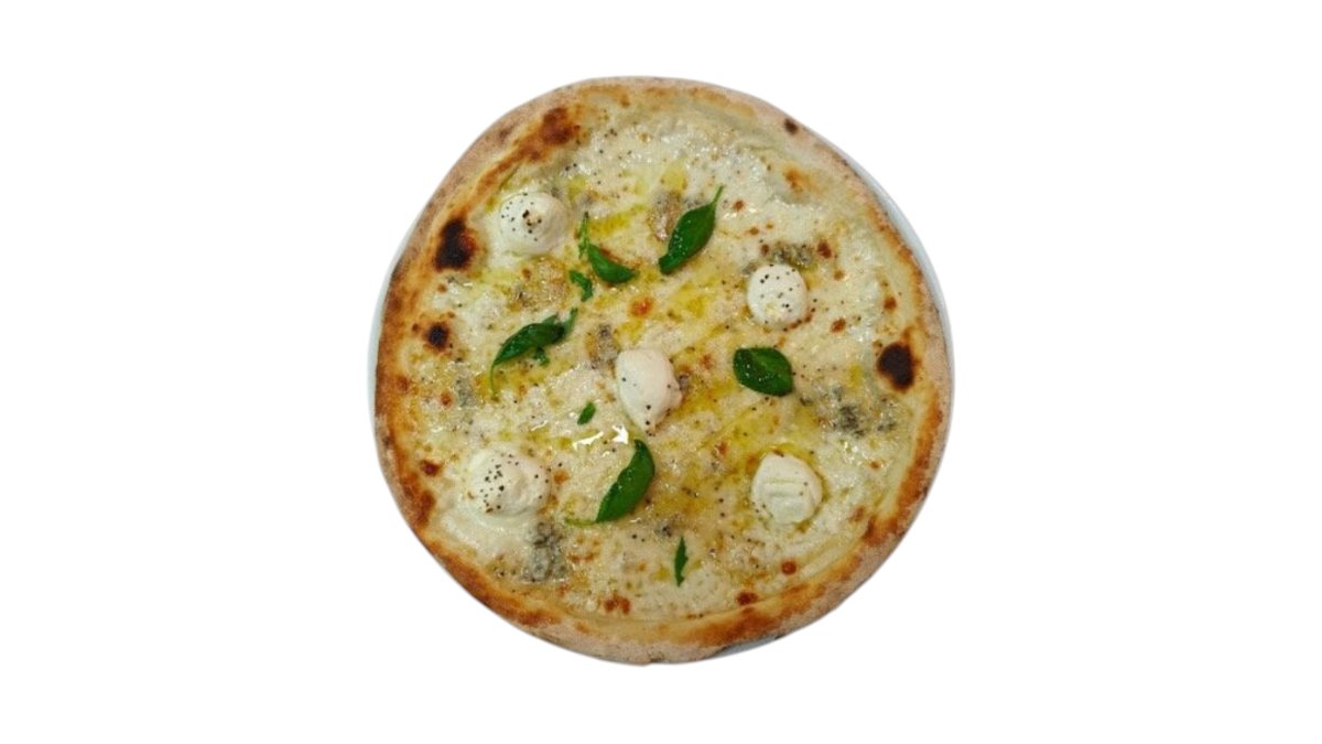 Fior de latte mozzarella, Gorgonzalo cheese, creamy ricotta, Parmesan cheese , black pepper truffle olive oil, fresh basil
