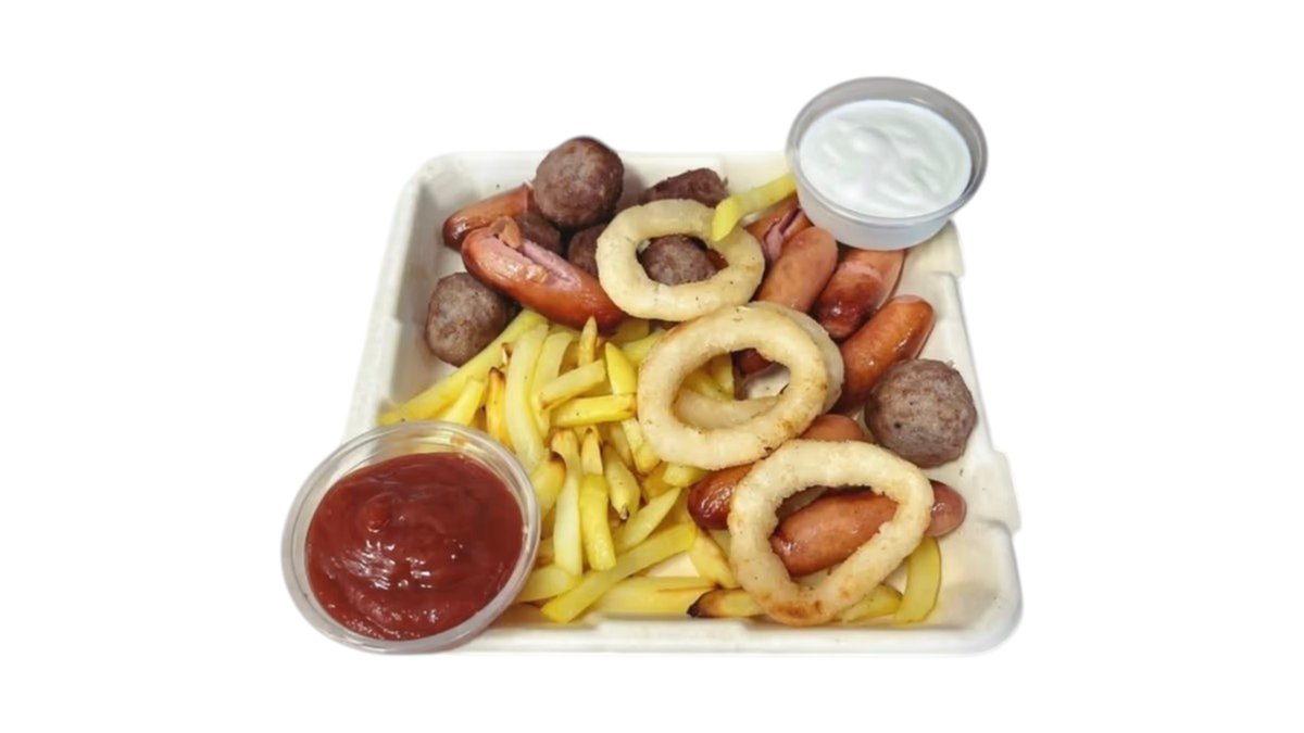 7kpl lihapullia,8kpl nakki,4kpl sipulirenkaita, ranskalaisia, lisäksi sour cream- dippi ja ketchup - dippi (Kotimaista lihaa)
