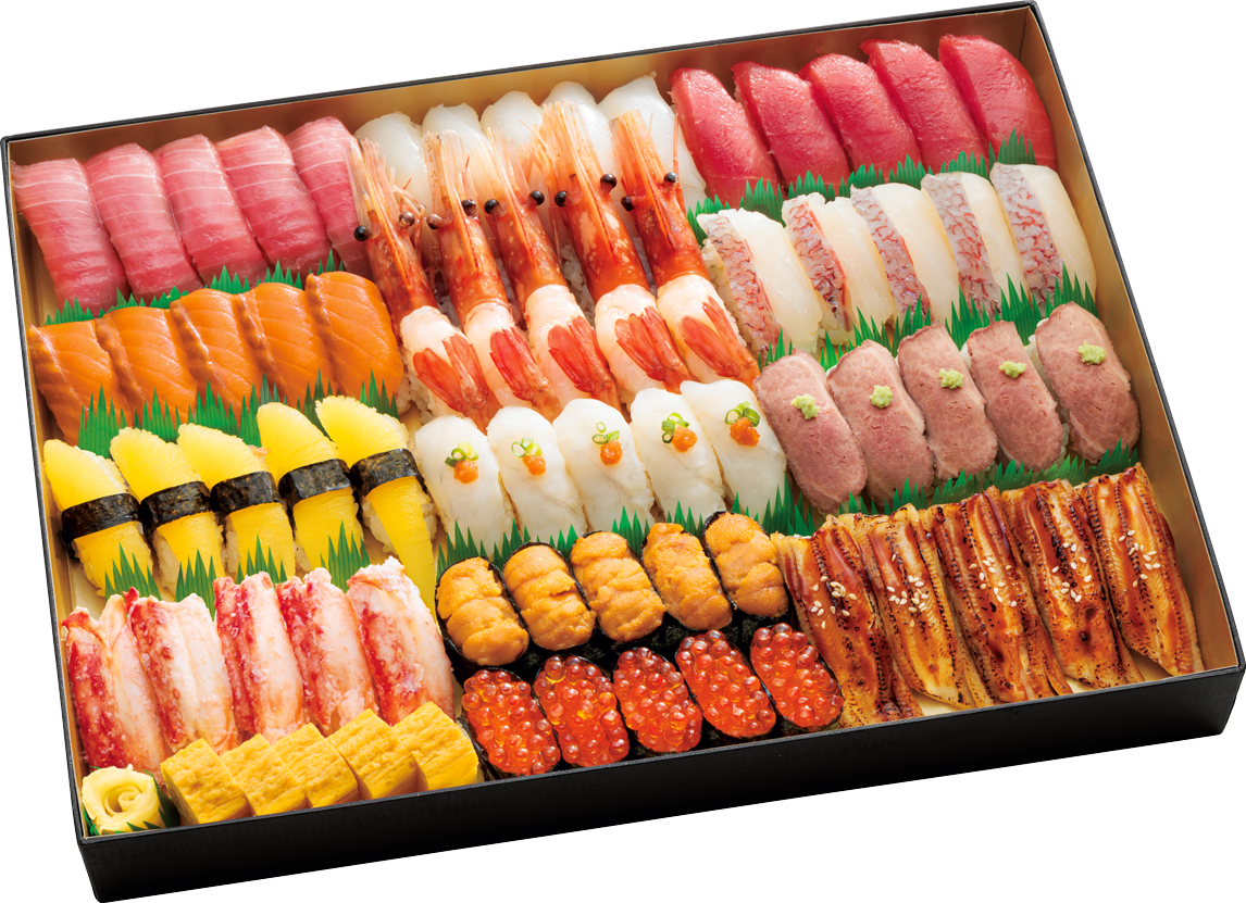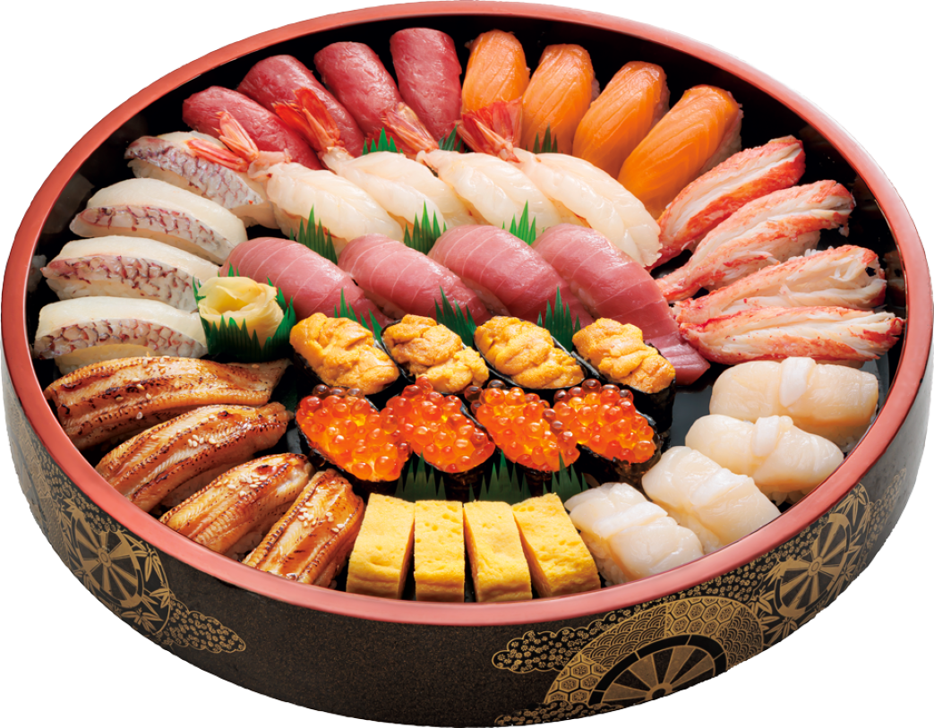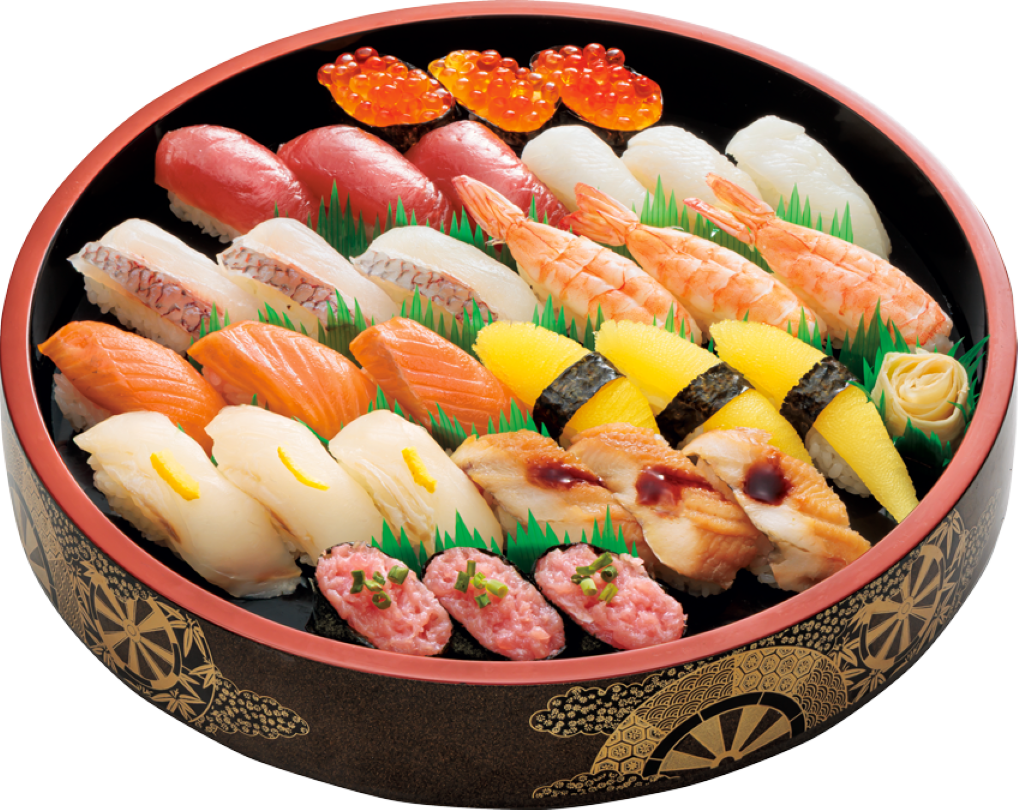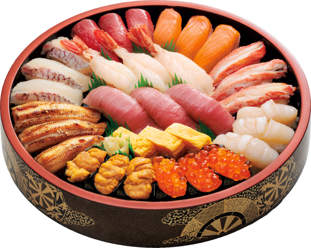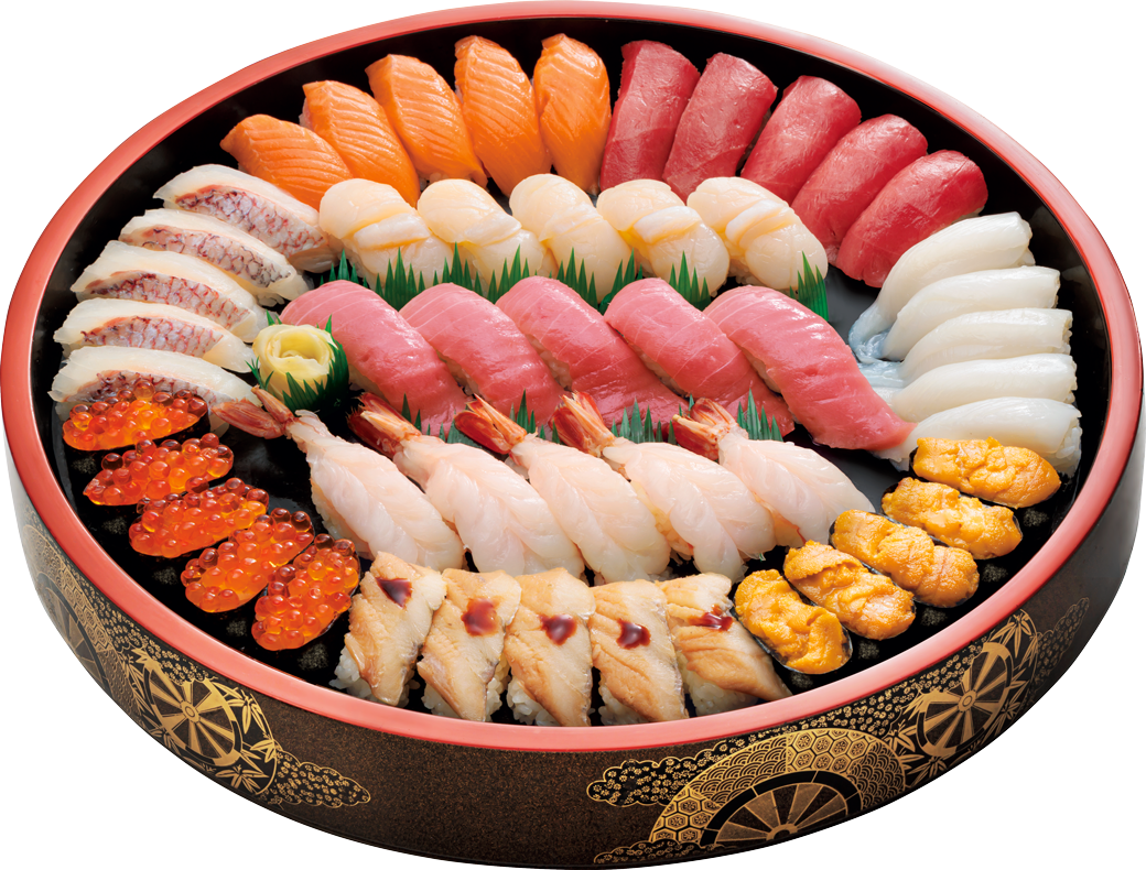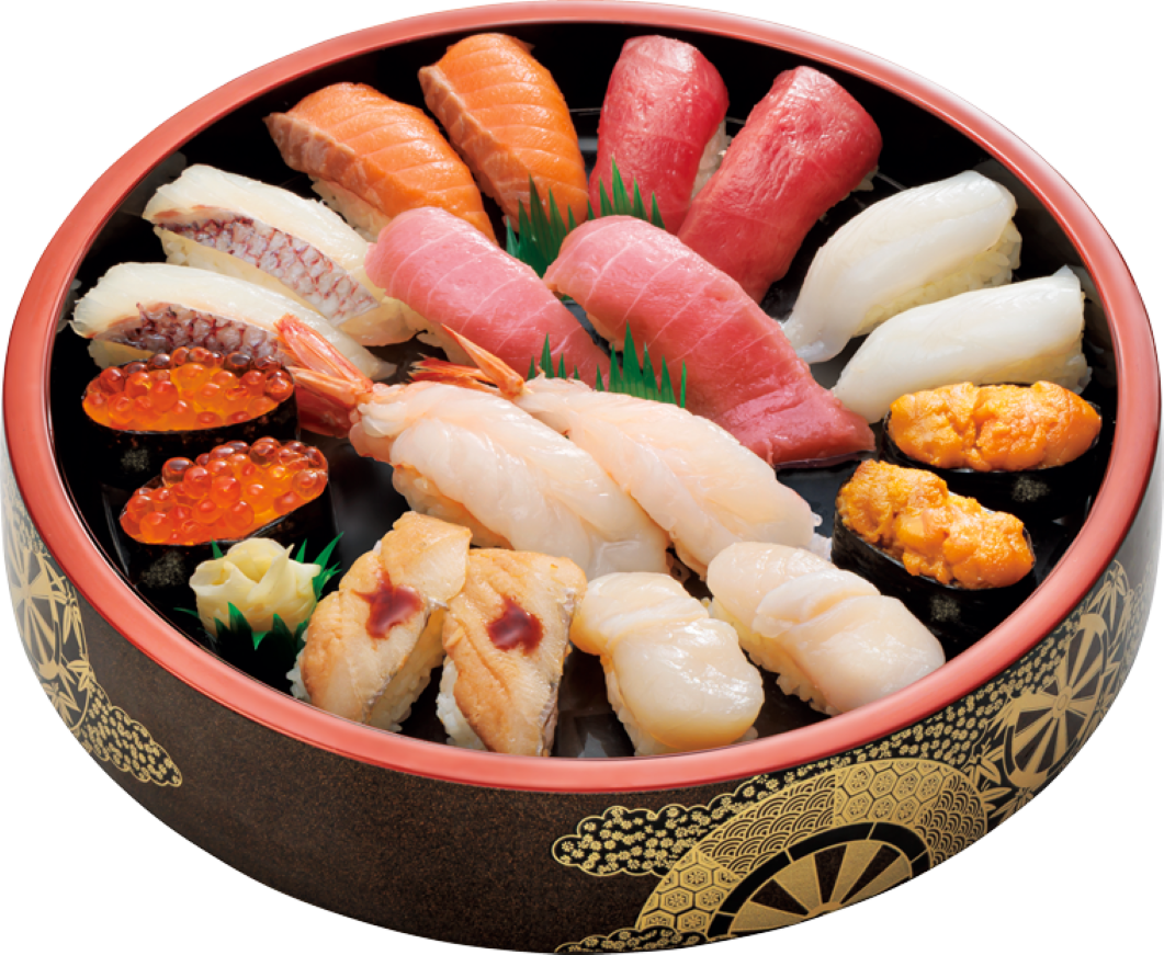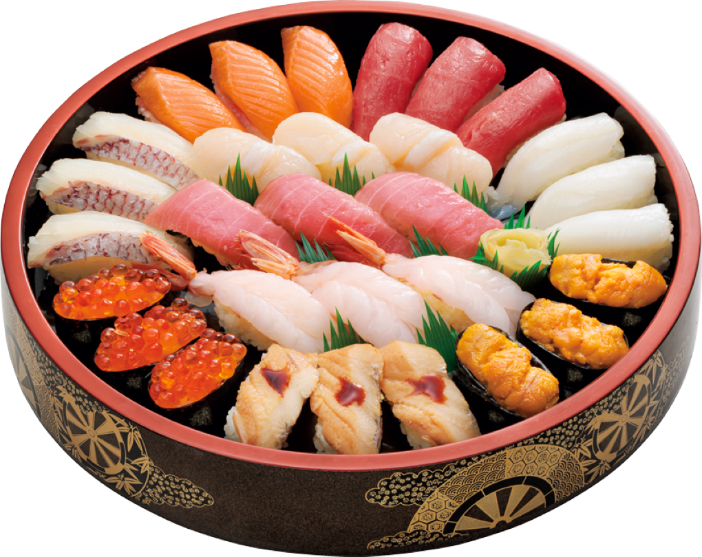 こちらの商品は12月24日から1月13日お届け限定となります。予めご了承ください。※上記期間内の日程でご予約ください。 3人前【30貫】 大空を翔る鷹のようにお客様の更なる飛躍と成功を祈念し名付けられた一品です。時には羽を休める鷹のようにお正月をこの一品でごゆっくりお過ごしください。 中トロ・北海道産ホタテ・サーモン・天草産真鯛湯引き・大生えび・いか・穴子・まぐろ・いくら軍艦・無添加うに軍艦