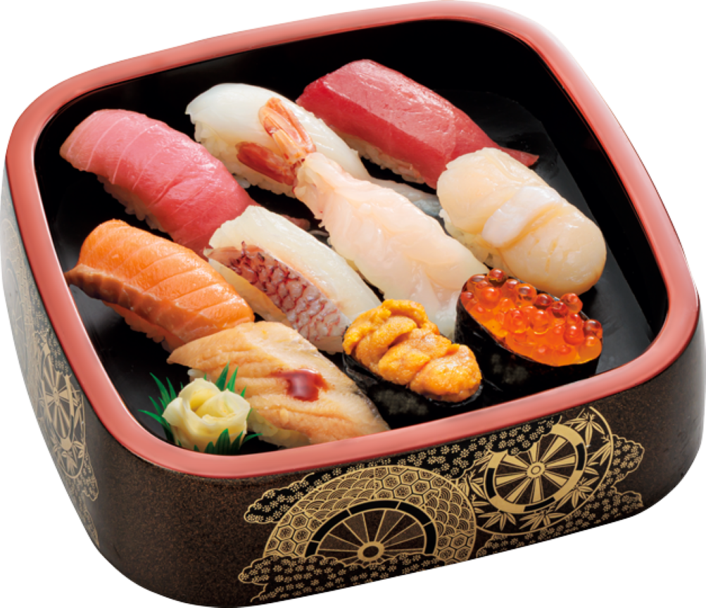 こちらの商品は12月24日から1月13日お届け限定となります。予めご了承ください。※上記期間内の日程でご予約ください。 1人前【10貫】 大空を翔る鷹のようにお客様の更なる飛躍と成功を祈念し名付けられた一品です。時には羽を休める鷹のようにお正月をこの一品でごゆっくりお過ごしください。 中トロ・北海道産ホタテ・サーモン・天草産真鯛湯引き・大生えび・いか・穴子・まぐろ・いくら軍艦・無添加うに軍艦