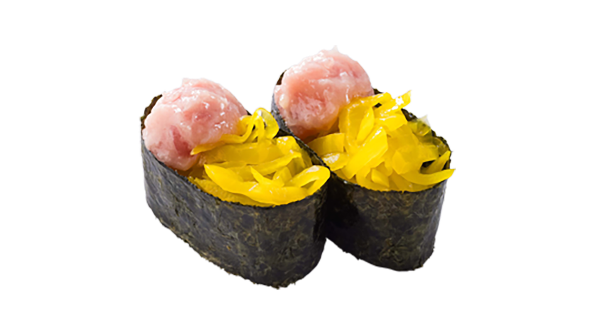 【商品説明】 【プラスもう1品】まぐたくぐんかんです。 【提供方法】 使い捨て容器に入れてご提供いたします。 【注意事項】 ※生もののため、天候等により欠品または品切れ、内容を一部変更する場合がございます。 ※アレルギー情報については魚べい・元気寿司のホームページをご覧ください。 ※全商品わさび抜きで提供しております。別添えの「小袋わさび」をつけてお召し上がりください。