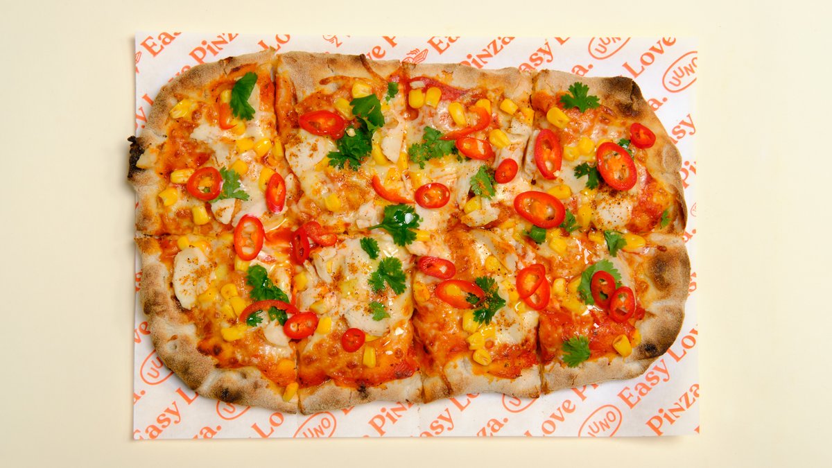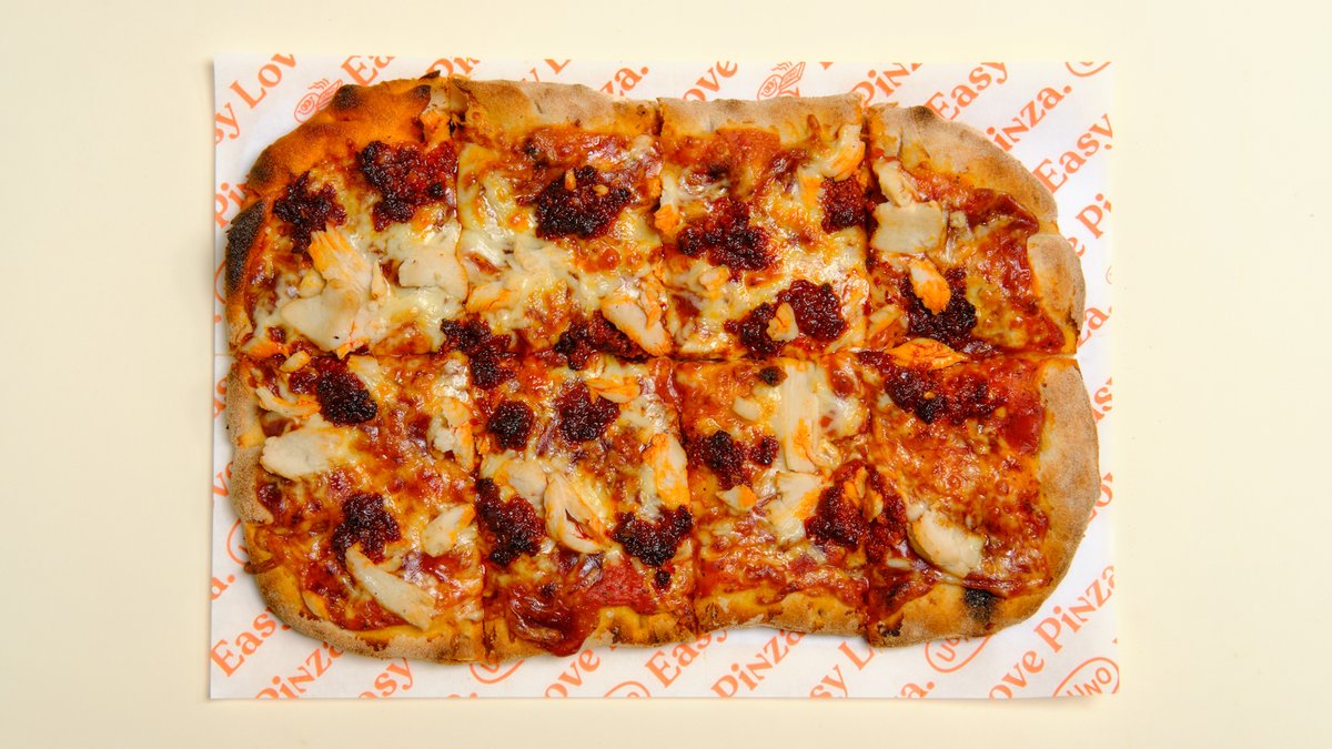 Tulinen tomaattikastike, mozzarella, kotimainen kana, 'nduja-salami, BBQ-kastike