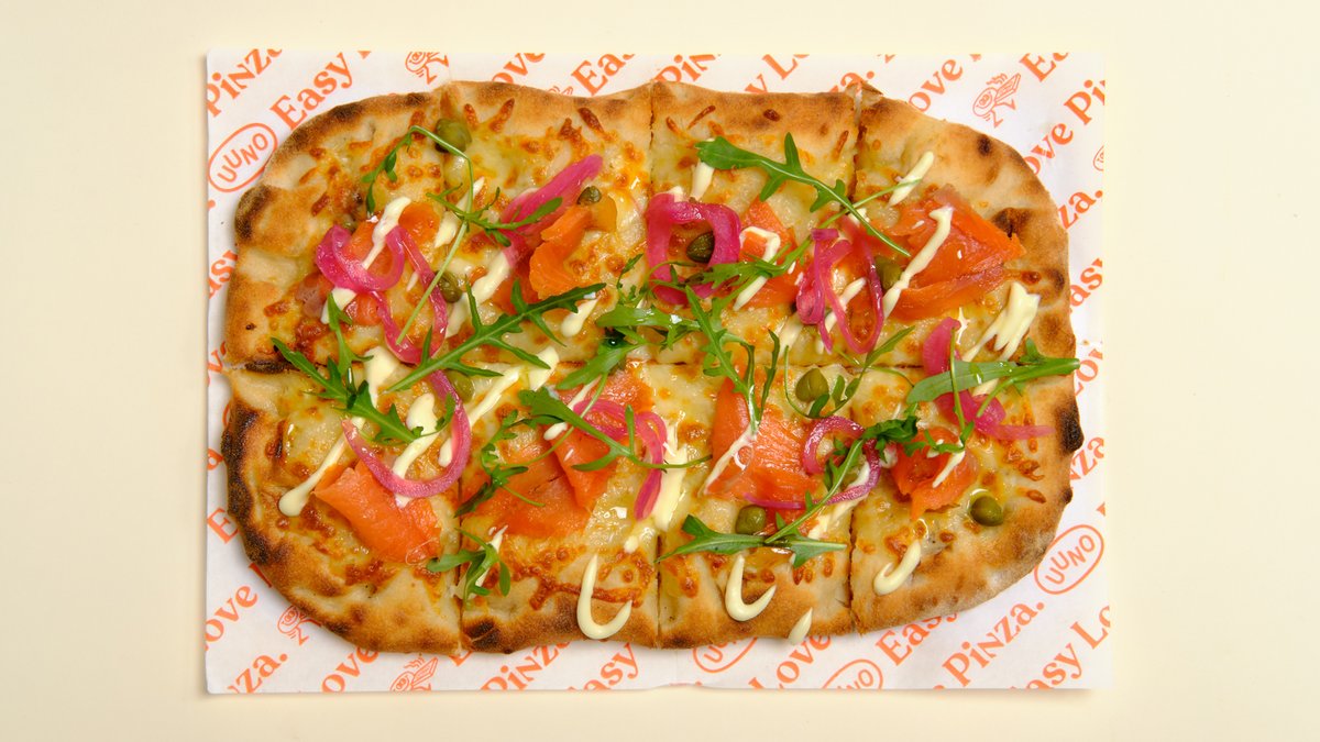 Mozzarella, kylmäsavulohi, kapris, pikkelöity punasipuli, limeaioli (ve), pikku rucola, extra-neitsytoliiviöljy