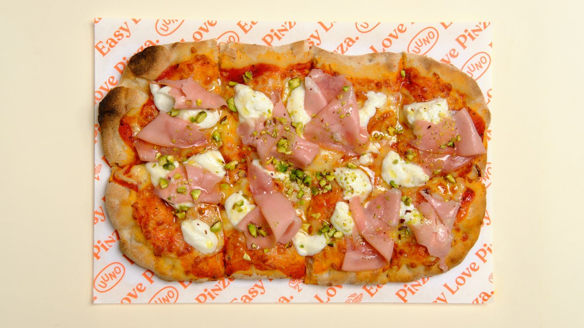 Tomaattikastike, mozzarella, mortadella, burrata, pistaasipähkinä, hunaja, extra-neitsytoliiviöljy