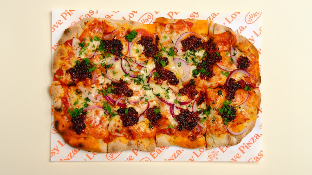 Tomaattikastike, mozzarella, 'nduja-salami, punasipuli, persilja
