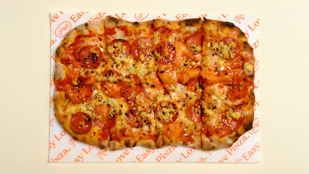 Tomaattikastike, mozzarella, kotimainen pepperoni, hunaja, aurajuusto, chilirouhe