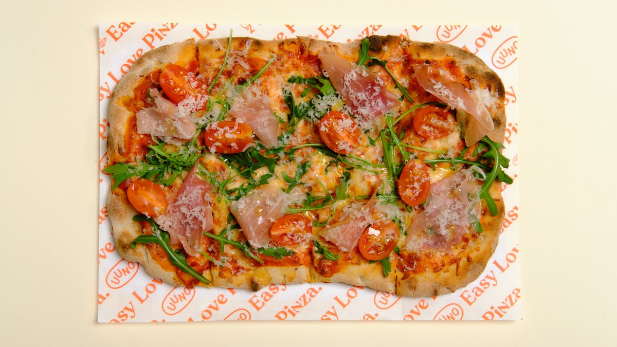 Tomaattikastike, mozzarella, prosciutto, rucola, kirsikkatomaatti, parmesaani, oliiviöljy