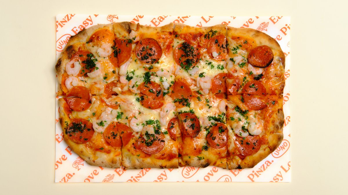Tomaattikastike, mozzarella, katkarapu, kotimainen pepperoni, persilja