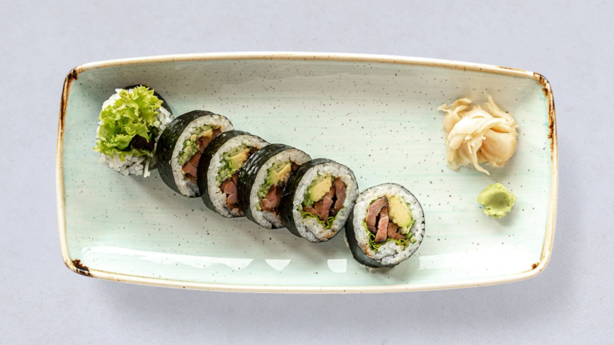 rolka sushi- nori na zewnatrz ryż i składniki w śodku
